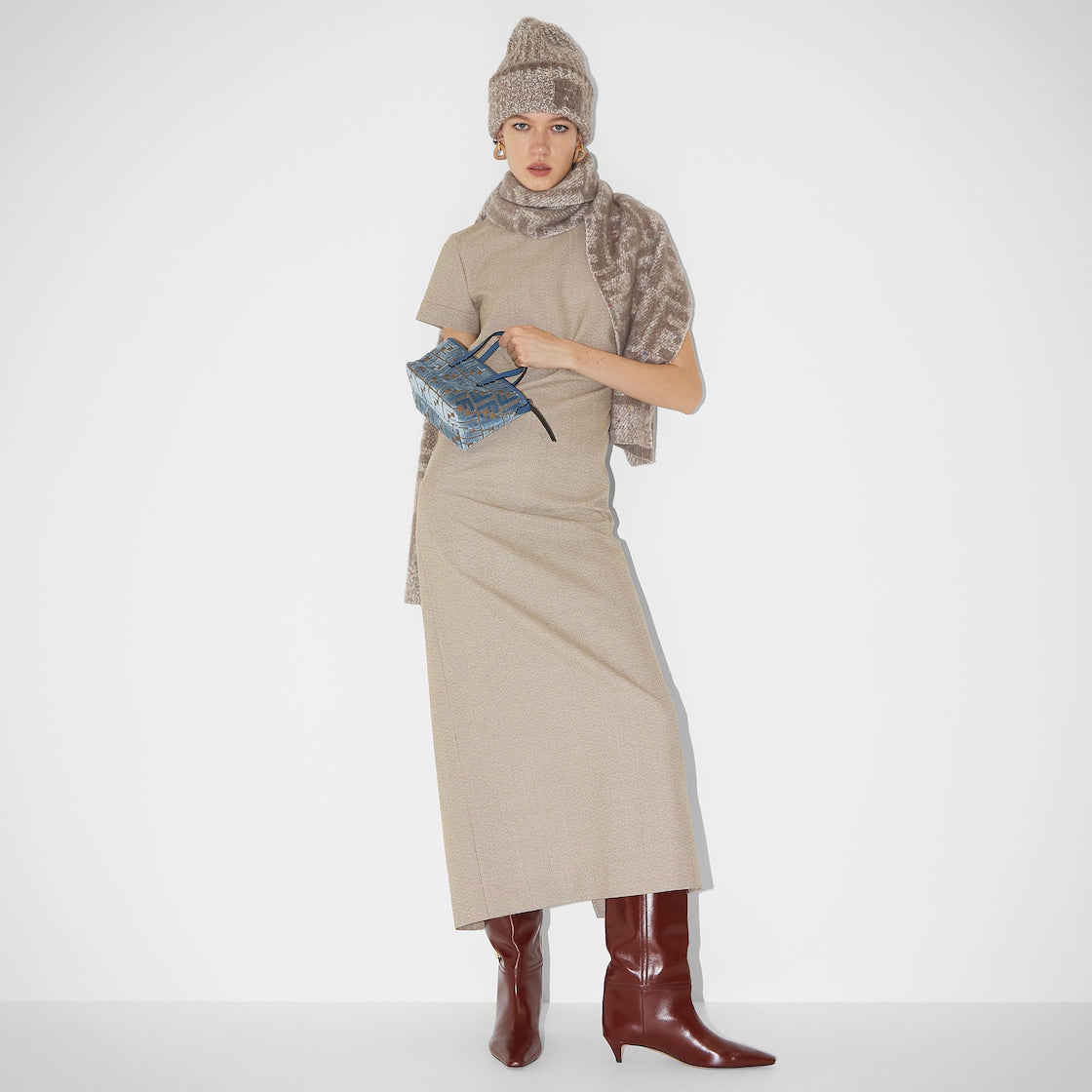 Made of jacquard velvet with the embossed FF motif in light blue on a beige base with light blue calfskin trims. Zipper closure with a long, knotted leather zipper tab.
